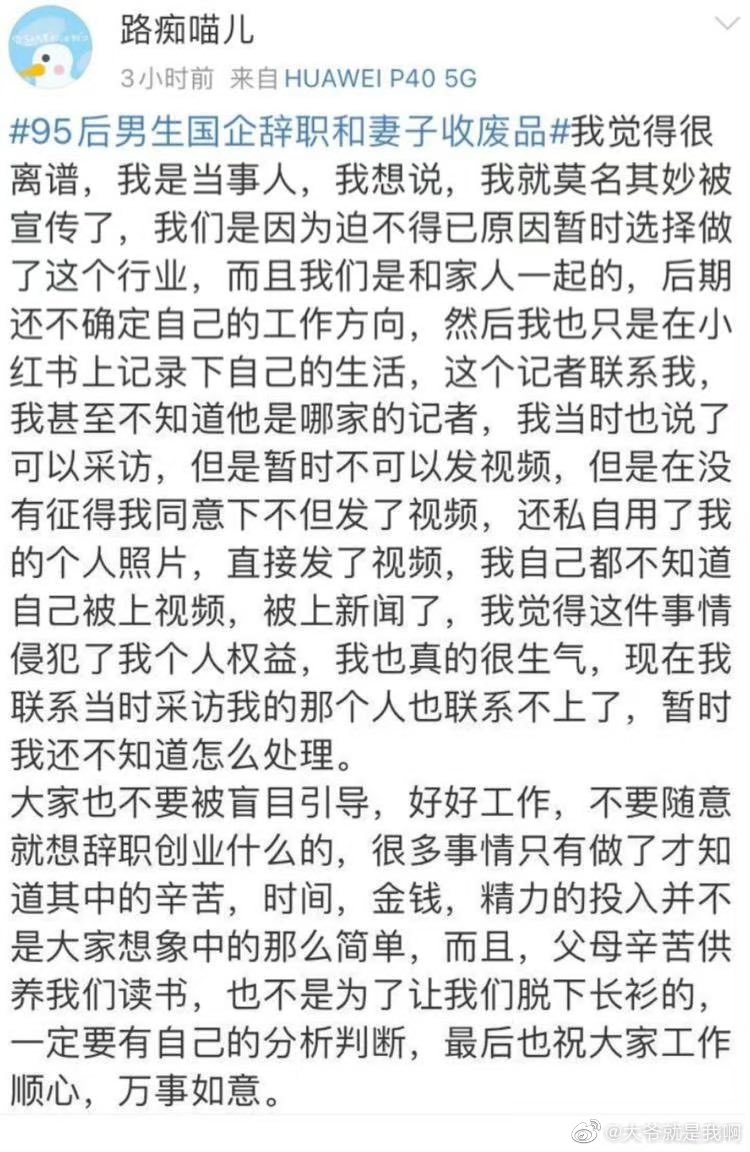 网友投稿官媒宣传95后男生国企辞职与妻子收废品,引得当事人出面澄清:系迫不得已,希望大家不要被盲目引导。