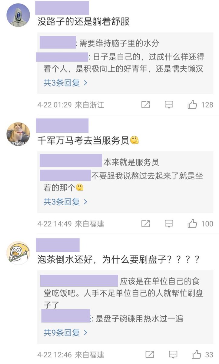 网友投稿小红书上一则关于“乡镇公务员”的帖子引发网友讨论。文中作者描述了自己在单位只要有领导过来就被要求端茶倒水洗盘子。有网友感叹:千军万马就考去当服务员。
