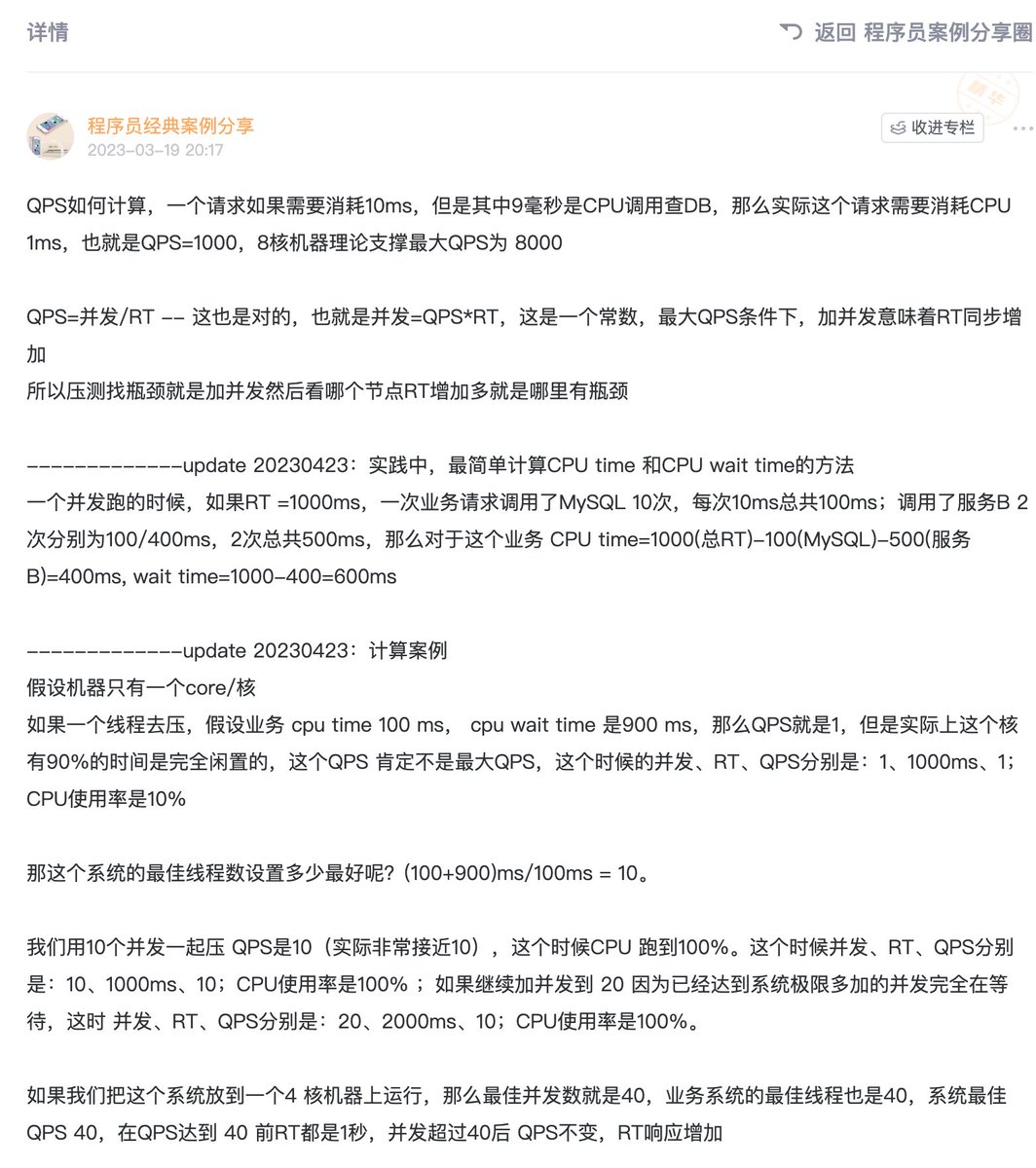 纸上得来终觉浅,还得好好举例子说明,虽然我反复讲过很多次 最佳线程如何计算,可是总会有想歪了的时候。推算最佳并发数、系统最大QPS是一个很重要的能力,如图。不过我是特别喜欢大家挖我星球里老的内容来看,这是非常好的学习习惯
