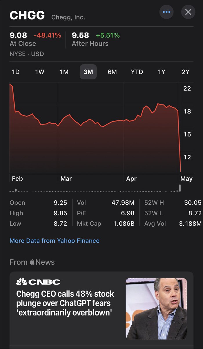 CEO和CEO真不一样。Chegg的CEO说chatgpt啊,可能会影响在线教育的获客。财报还没有出来,股价跌去48%,公司市值蒸发10亿美元。这个公司活活被折腾死,PE只有7…。