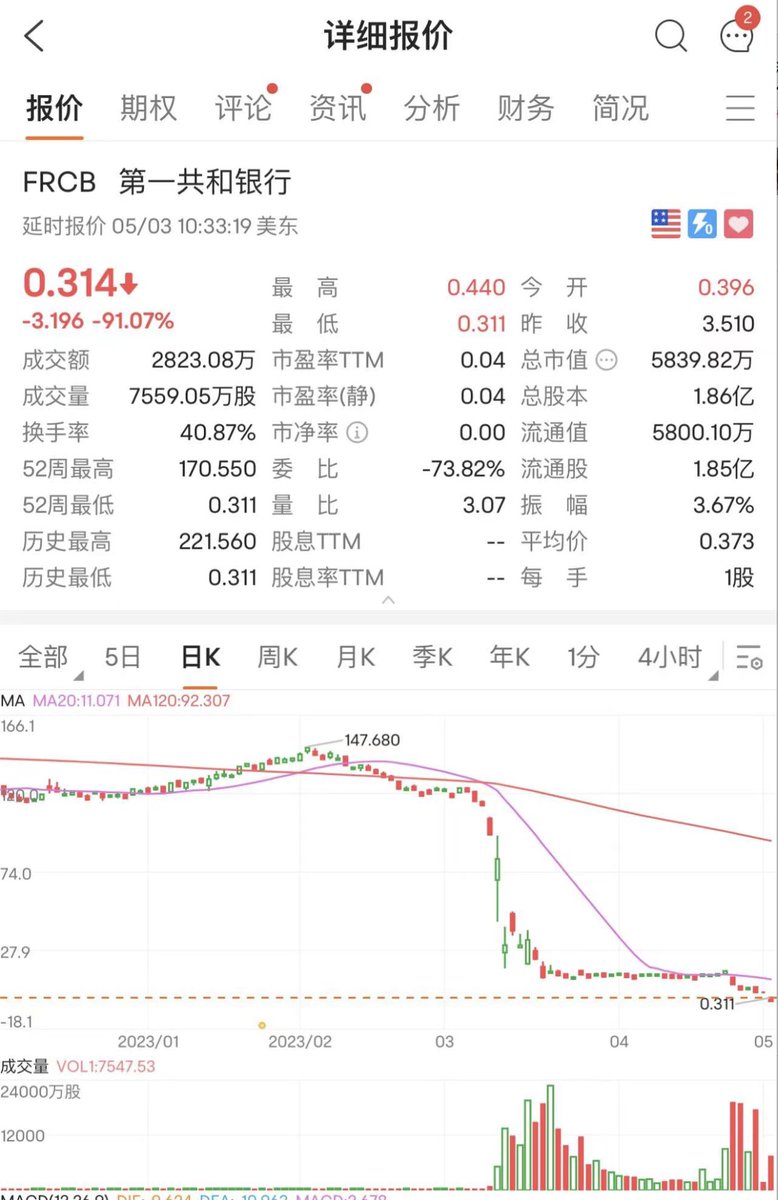 美国第一共和银行从147跌到0.3。。。币圈崩盘的Luna和FTT都不敢这么跌啊。。。