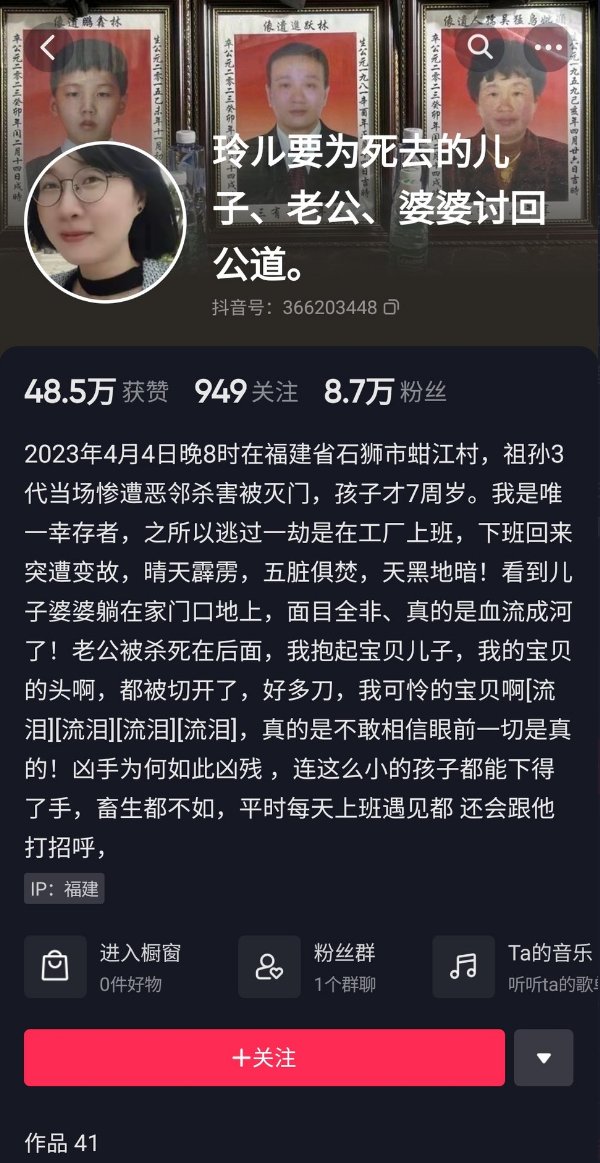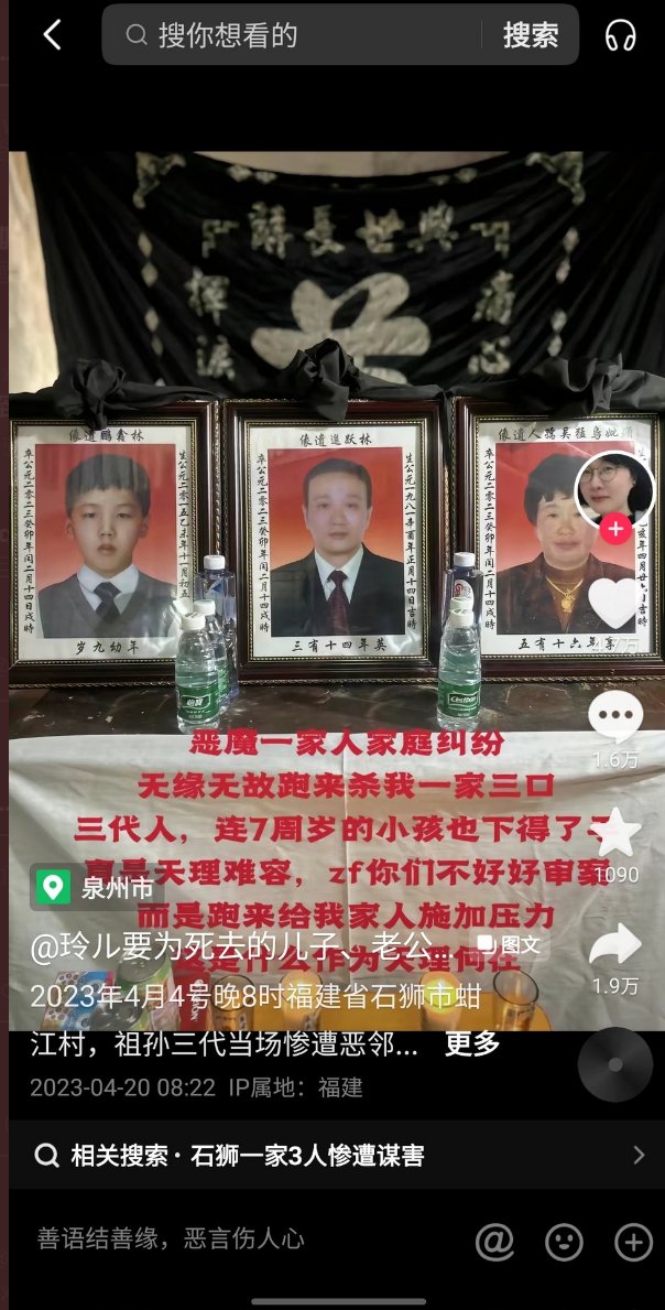 网友投稿抖音一名博主称,2023年4月4日,在福建省石狮市蚶江村,疑似因邻里矛盾,一家祖孙三代遭邻居灭门。博主称,事后当地政府曾跑到博主家中给其家人压力。