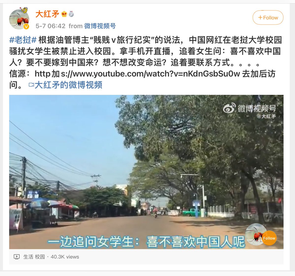 前有某博主在伊朗骚扰当地女性,现有猥琐男纠缠老挝女性,台词都是想不想(跟我)去中国🤮