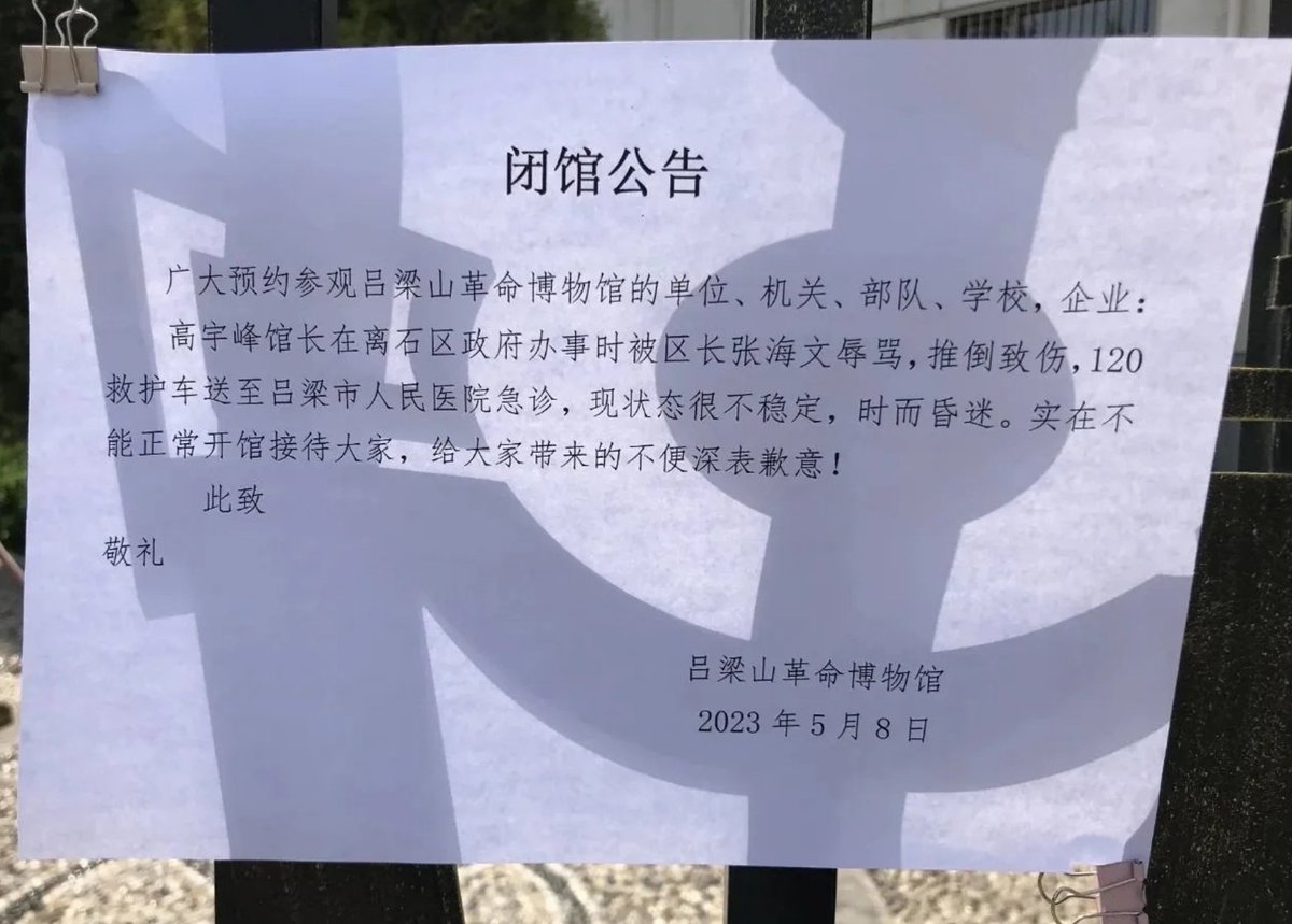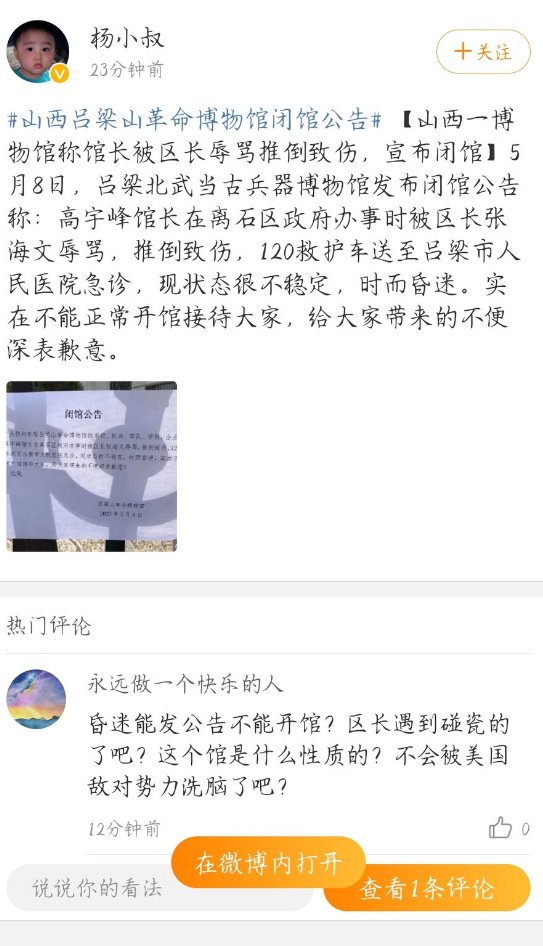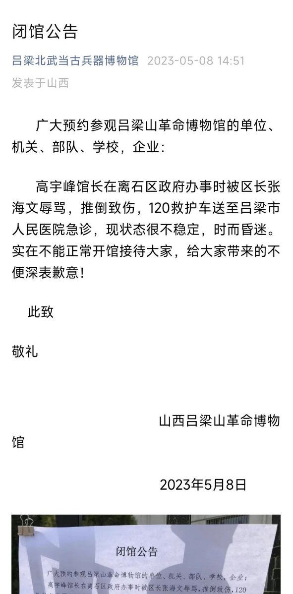 网友投稿5月8日,山西吕梁山革命博物馆发布了一则了另类的闭关公告,公告称,因博物馆馆长高某在区政府办事时被区长张某辱骂,推倒致伤,现状态很不稳定,故无法正常开馆接待。向大家表示歉意。