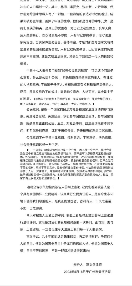 以下是王爱忠案件律师的辩护词,在律师发表辩护词期间,多次被法官打断,从而无法进行全部的陈述。连律师的辩护词都不让讲,他们究竟在怕什么。开庭当天里面坐了5、6位官派的旁听人员。就连我作为妻子都无法进去旁听。这简直就是个笑话。
