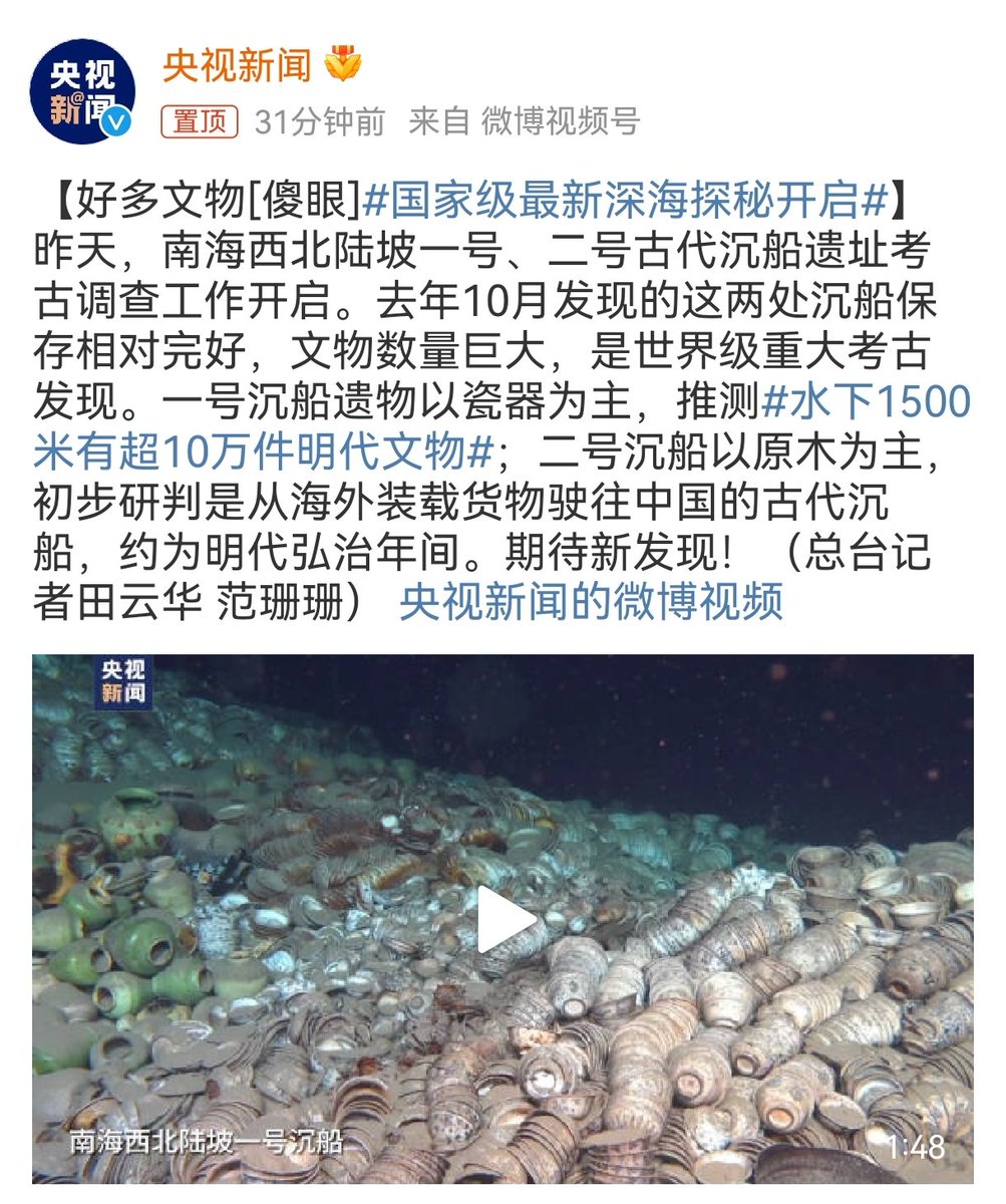明代弘治年间南海沉船调查工作开启:一号沉船遗物以瓷器为主,推测超10万件明代文物~好家伙,一船明代的瓷碗盘子碟子茶壶喂。茫茫南海,不知水下掩藏着多少古代的秘密 …