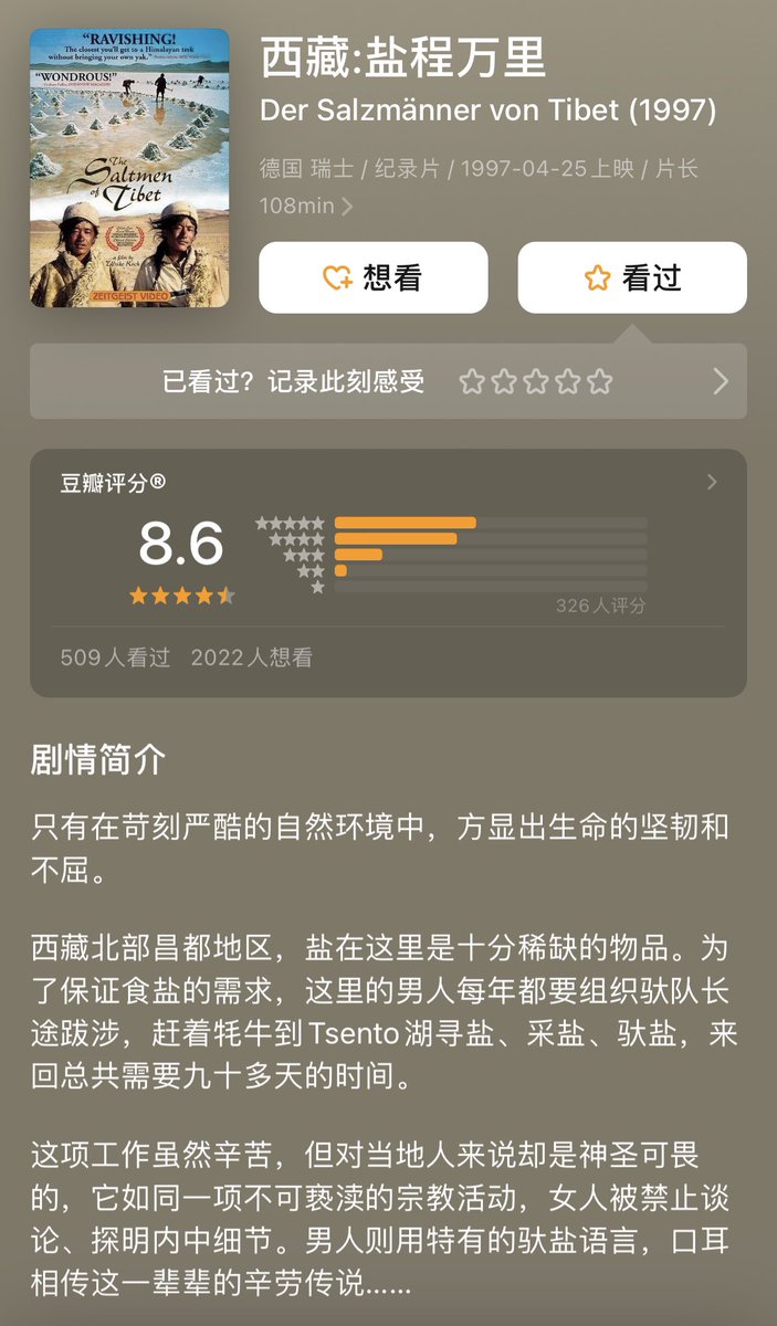 是的。1997年的纪录片,讲述藏北羌塘牧人赶着牦牛万里圣湖取盐、驮盐,及与农区农民交换糌粑的传统。牧人出身的作家加央西热的著作《西藏最后的驮队》更是写得非常详细。