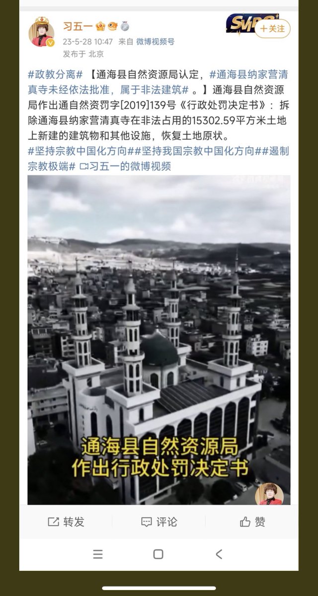 后续补充有知名爱国博主发文表示,根据19年的一份行政处罚决定书,纳家营清真寺属于未经批准的非法建筑