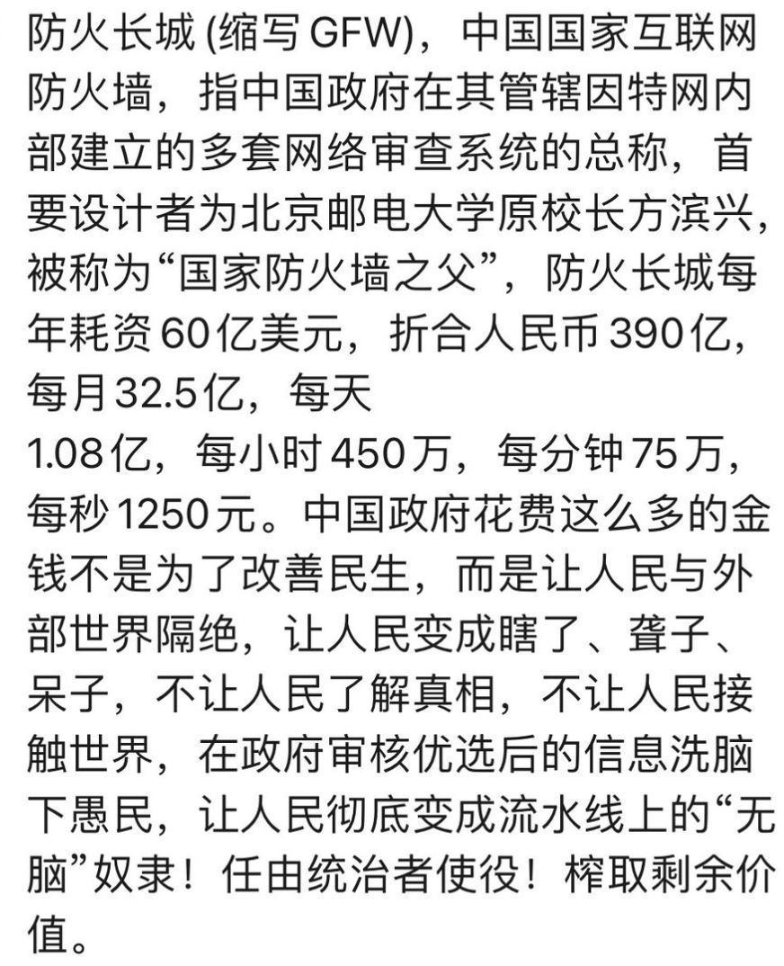 中国的网络防火墙(防火长城),每年的经费是60亿美元,平均每分钟75万。只为了让人民看不到墙外的信息,中共政府不惜下血本呀!