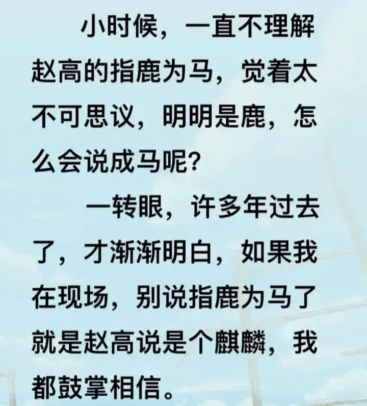 原来觉得指鹿为马的故事是笑话,现在来看,太真实了。如果现在的最高统治者指着鹿说是马,那么你会赞同吗,九千万党员和十四亿人有多少敢站出来说这是鹿呢?