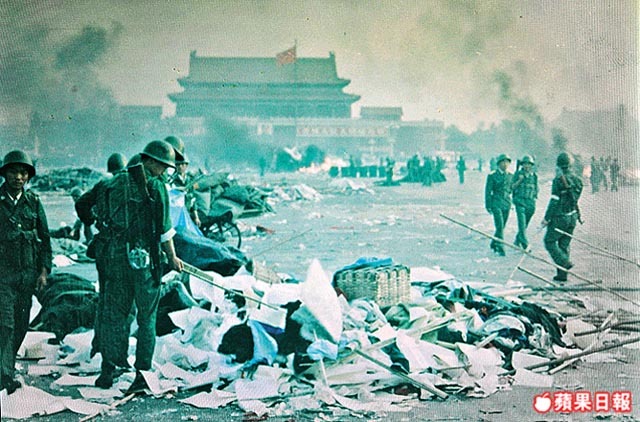 苹果日报:89年6月4日清晨时份,已佔领天安门广场的解放军,放火焚烧杂物。摄影:陈光
