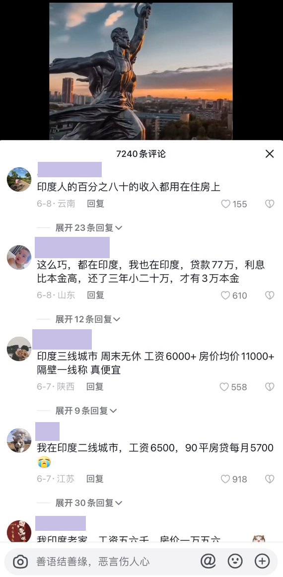 网友投稿在一则视频下,网友纷纷吐槽“印度”的高房价问题据悉,由于在抖音上禁止讨论中国现状,所以网友们在评论区里便开始使用其他国家来代指中国。