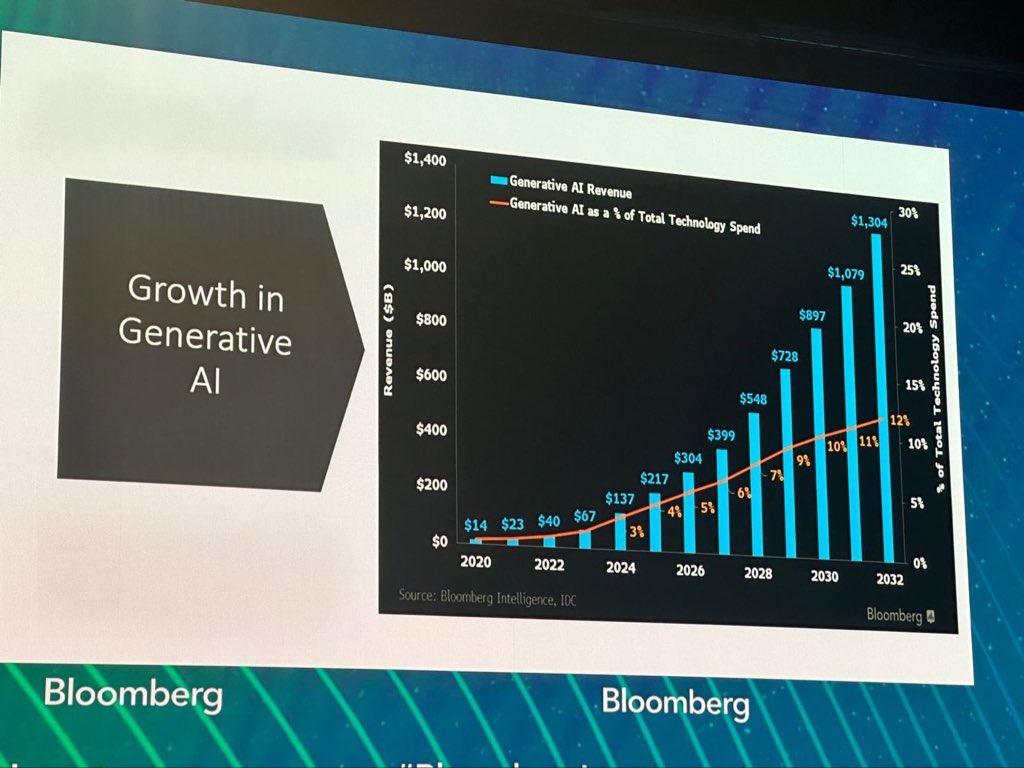 彭博社预测,到 2032 年,生成式人工智能的收入将达到 1.3 万亿美元,占所有技术支出的 12%