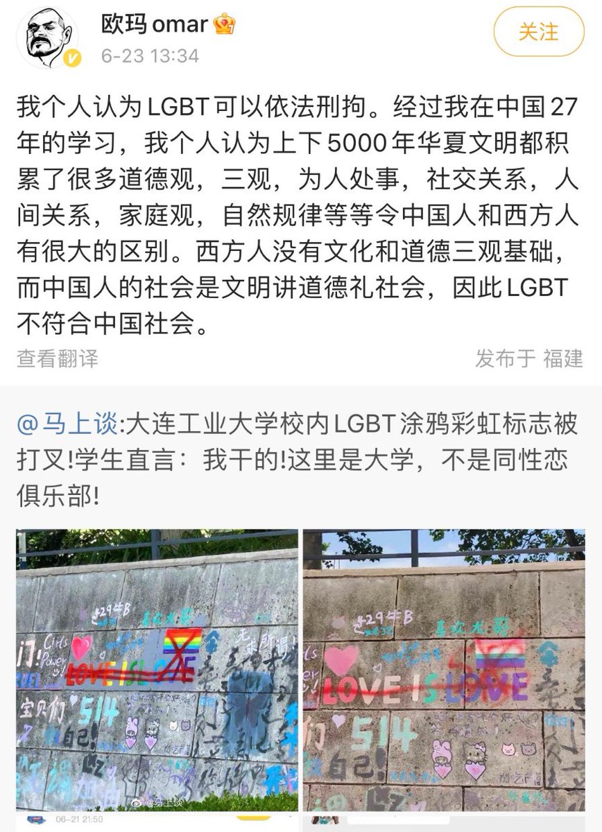 网友投稿6月23日,大连工业大学校内的LGBTQ+涂鸦和彩虹标志被破坏。随后有学生站出来表示是自己做的,因为“这里是大学,不是同性恋俱乐部”。该行为在网上获得了一系列网民支持。