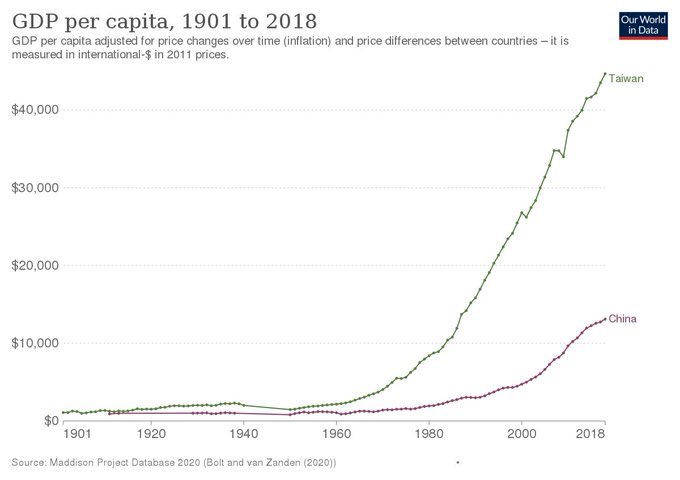 台湾和中国大陆地区120年来人均GDP增长比较,证明了台湾成功的关键就是没有共产党领导+拥抱美国