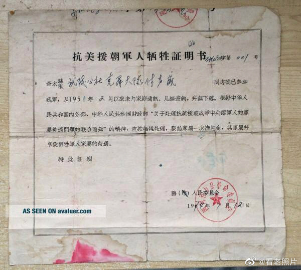 一份1974年补发的《抗美援朝军人牺牲证明书》和一次性补助抚恤金180元的票据。