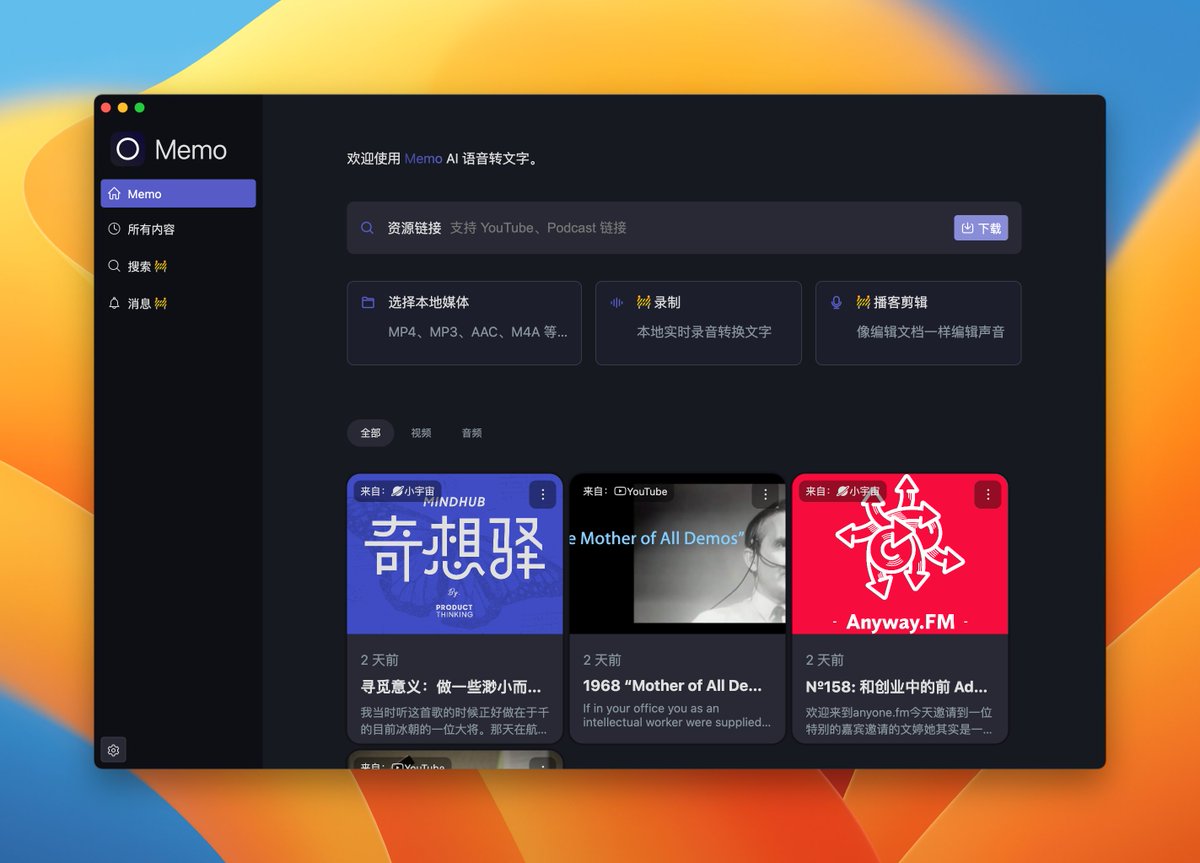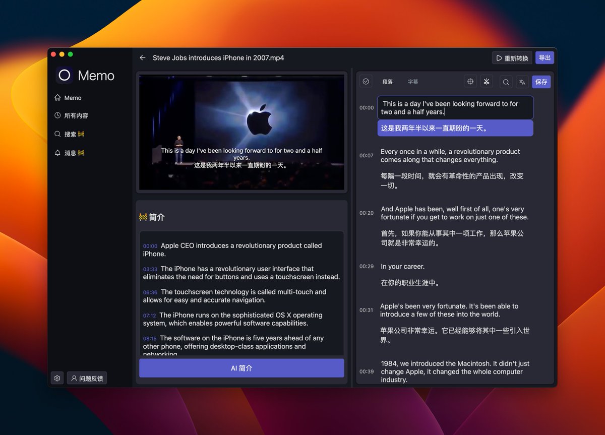 #AI产品推荐:MemoMemo - AI 驱动的视频、播客转文字、字幕工具推荐个字幕识别和翻译的工具Memo支持多平台,利用Whisper技术识别语音到到字幕,然后可以对识别的字幕进行简单的编辑。另外可以对识别的字幕翻译,支持Google翻译和OpenAI(需要自己的API Key)…