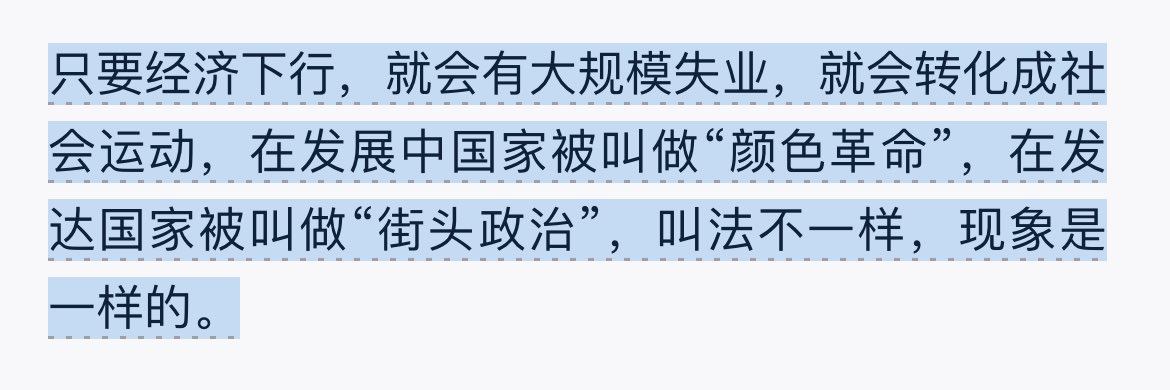 只要经济下行,就会有大规模失业,就会转化成社会运动,在发展中国家被叫做“颜色革命”,在发达国家被叫做“街头政治”,叫法不一样,现象是一样的。