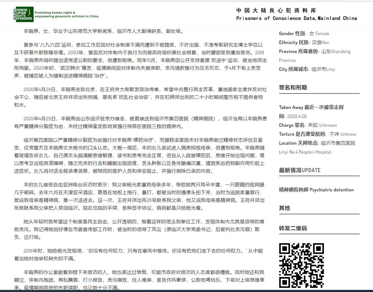 #丰晓燕,女,山东人,副处级‘八九六四’参与者,因对社会制度不满遭当局打压2003年因反对体制内不良行为而被殴打成重伤2019年要求退党退公职遭到拒绝同年10月因支持“反送中”被拘留2020年在王府井散发传单,希望中共推行民主,被抓捕后被关押在临沂市第四医院(精神病院)#一人一推