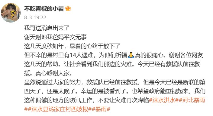 8月3日傍晚,河北涞水发布一条通告,表示当地没有人员死亡。如此来势凶猛的洪灾,真的没有人员伤亡?很快就有人发声仅他们村就有14人遇难。根据这名学生的聊天记录显示,附近村庄同样也有人遇难。上观新闻也立马发表新闻稿,称掌握的证据显示遇难人数绝对不少。然而随之而来的是当地开始封路,阻止记者采访,并坚持表示:没有任何人员伤亡。在一个视生命如草芥的地方,根本不在乎人的生死!