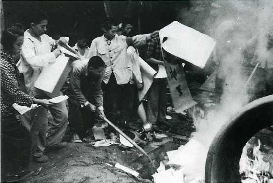 1966年8月红卫兵在“破四旧”(旧思想、旧文化、旧风俗、旧习惯)的号召下,杀向社会,图为红卫兵焚烧古字画。