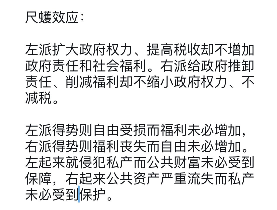 秦晖教授说的尺蠖效应,其实也解释了中国分配制度的严重缺陷:不管什么政府上台,都一样不主动承担责任,反而还推卸责任;福利不但不会增加,反而还会缩小;不论左右,私产都得不到保护。连初次和二次分配都不公正,就急不可耐地打第三次分配的主意。但不管什么分配,平民都分不到红利得不到保障。