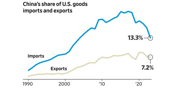 目前,来自中国的商品在美国进口中所占的份额是 20 年来最小的。按照这个速度,美国至少还需要 10 年左右的时间才能与中国完全脱钩。 但我相信習近平總加速師會踩油門加快速度