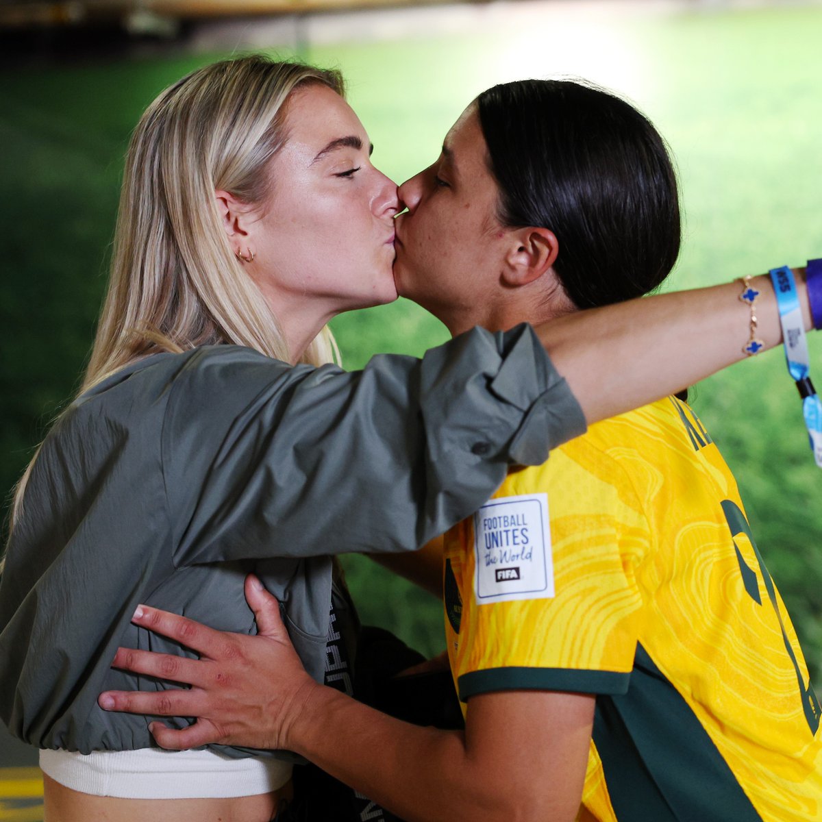 Sam Kerr celebrates the Matildas' World Cup victory over France with her partner Kristie Mewis ❤️#FIFAWWC #DubAtTheCup #Matildas #AUSFRA