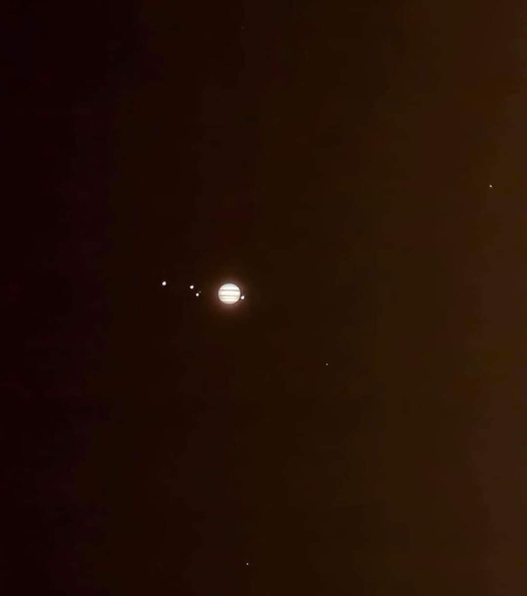 Jupiter and its 4 Largest Moons glowing in the Night-sky. Ganymede, Europa, and Callisto on the left, Io on the right side. 🌌📸: Luis Argerich