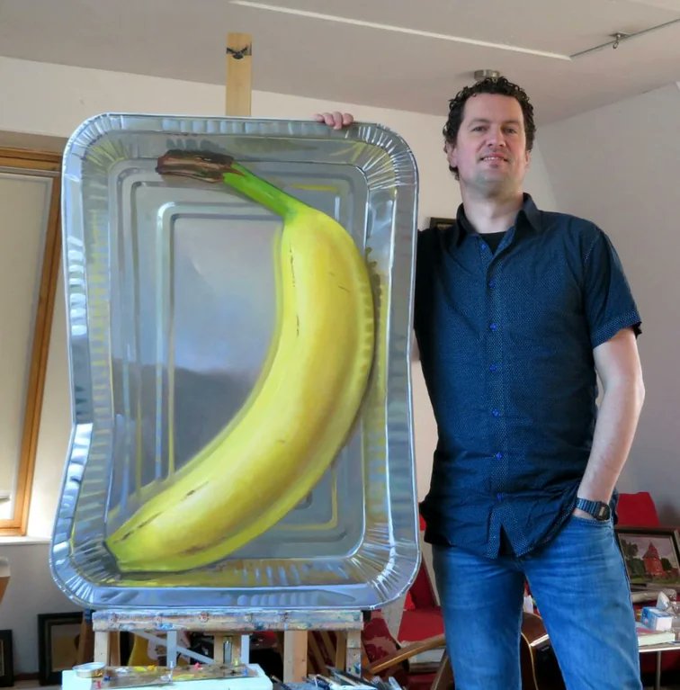 «This is not a banana»It's actually a hyperrealistc 3D painting of a banana in an aluminum container by artist Rutger Hiemstra
