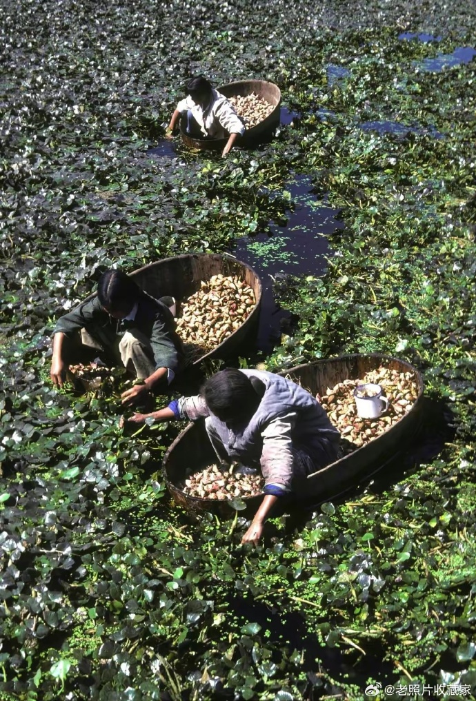70年代,坐在木盆船中采集菱角,划这个船可是技术活。