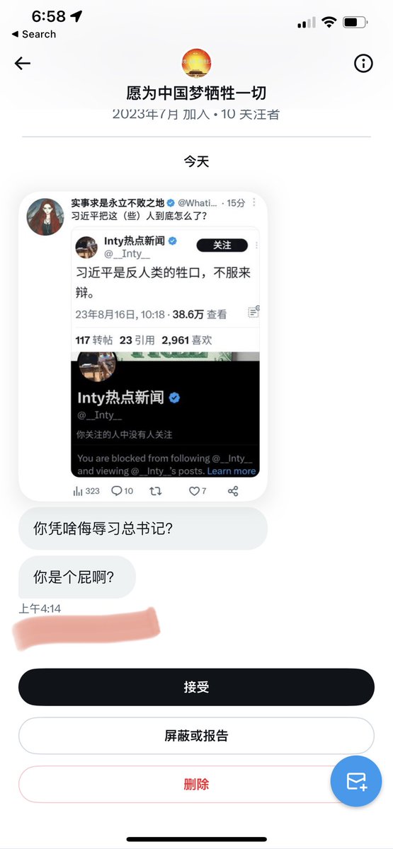 下面這個中國五毛粉紅給我的私信,他罵我為什麼侮辱習總書記。😂