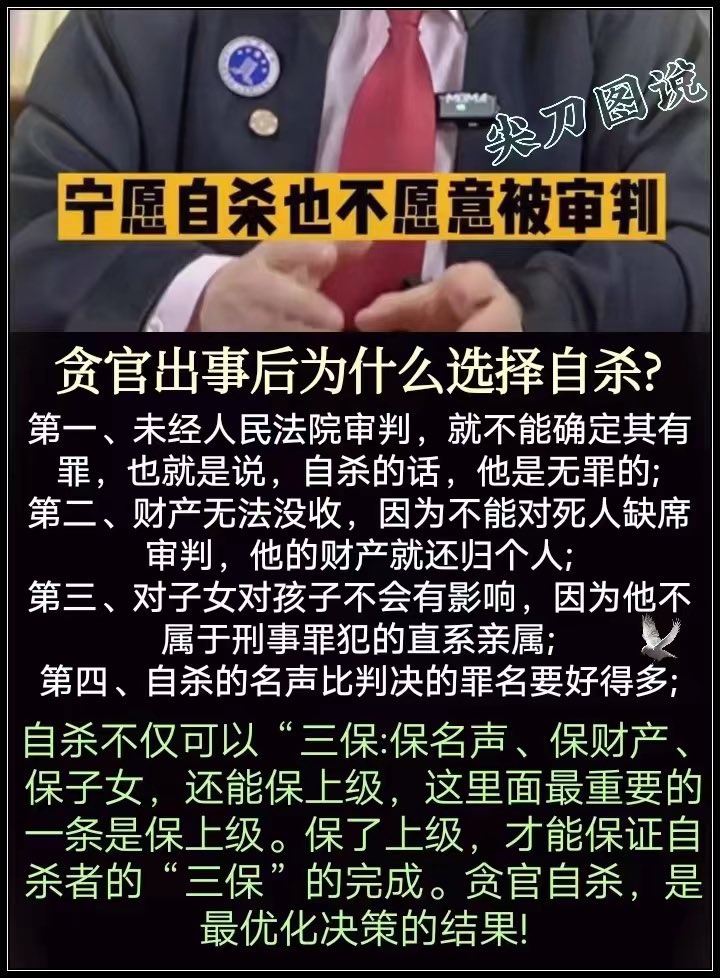 第一次听人细数“自杀的好处”。当然,这样的自杀的好处仅对于贪官而言,因为他们是畏罪自杀。对于良民,因为忧郁症而选择轻生,当然不在此列。