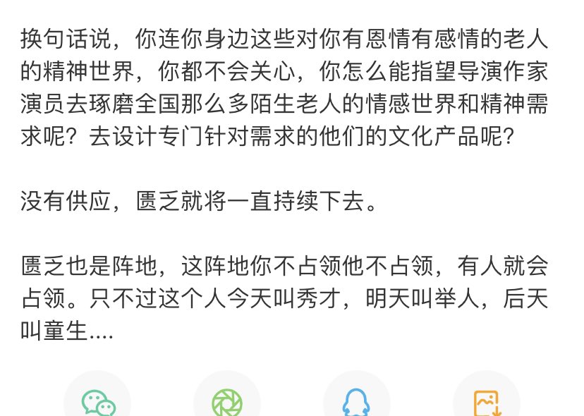 老年人的精神世界是匮乏的,青年人也一样匮乏。没有市场供应会匮乏,有市场供应还是会匮乏。 人的情感需要是需要人去回应的,而人们又是互不信任彼此攀比的,很难得到有效回应。 青年人长期得不到回应,就去刷抖音快手Youtobe;老年人长期得不到回应,他们就去追秀才、追一笑倾城。 社会大环境如此,无解。只能看着匮乏的人们继续滑向深渊,寻找一个又一个替代品。