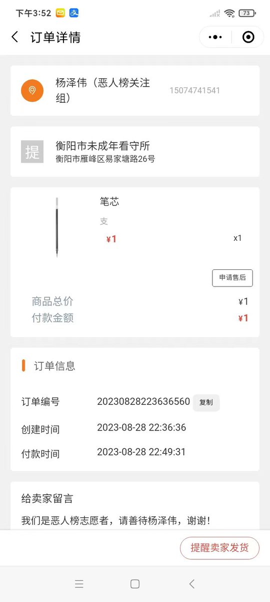 上周给杨泽伟买的一支笔芯已经送出去,这周继续下单买东西。关注政治犯就是关注自己的未来,因为发生在别人身上的不公也会发生在自己身上!