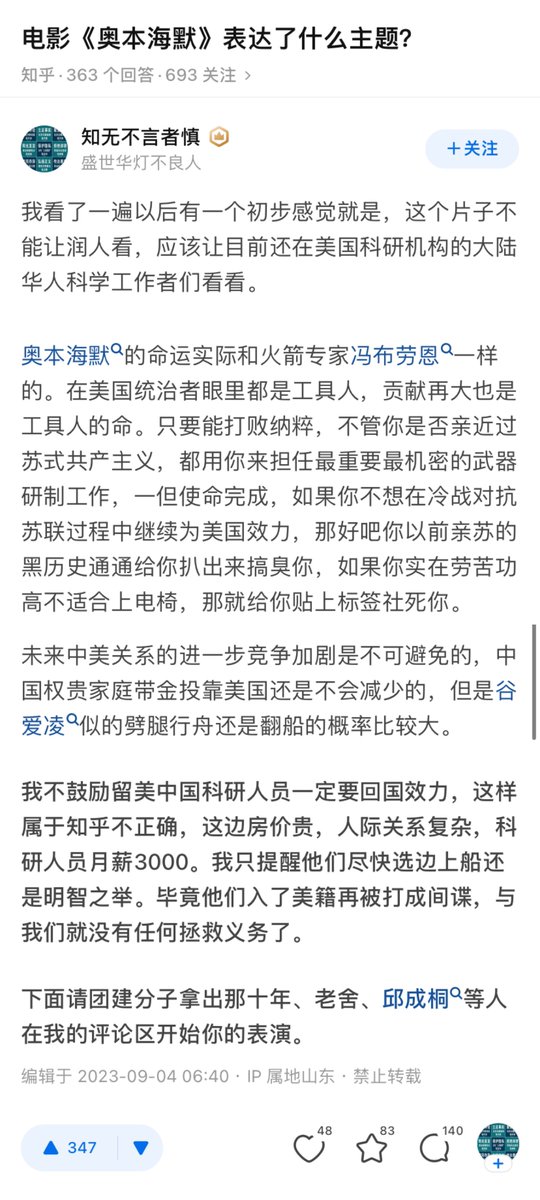 《奥本海默》应该给在美华人科研人士看看,你们就是美国的工具人,中美关系恶化大势所趋,毕竟你们要入了美籍再被打成间谍,我们就没有任何拯救的义务了!#知乎 #暴论
