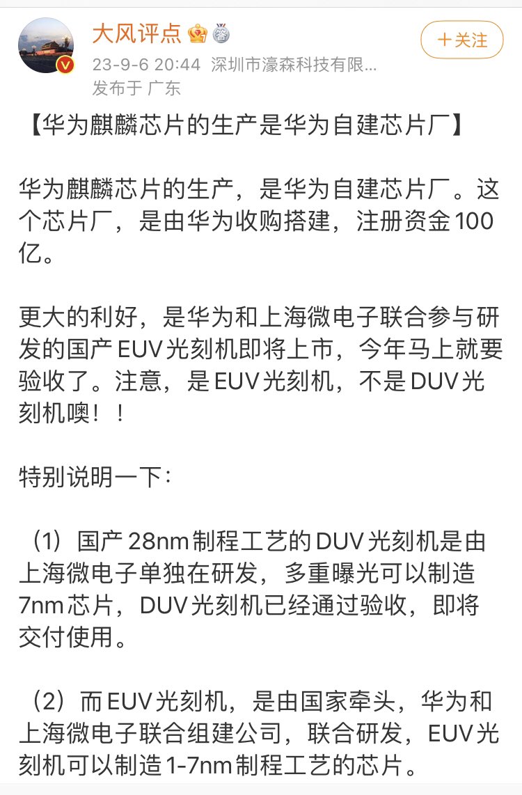 震撼新闻来了:1、深圳市濠森科技有限公司总经理发文,Mate60Pro芯片由华为自建厂生产,并非中芯国际。2、DUV光刻机已经通过验收,即将交付使用3、华为和上微共同研发的EUV光刻机年底之前验收、明年交付商用4、一旦国产DUV,EUV商用化成功,将禁止同类国外光刻机产品