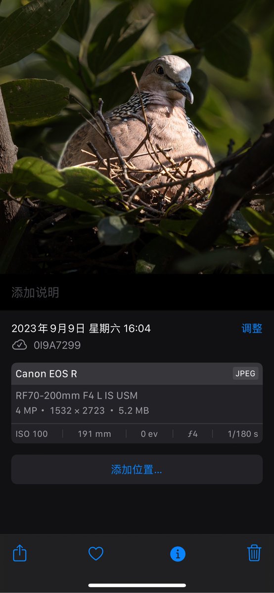 咕咕的正面高清大图来了!感谢好哥们带来的「Canon EOS R 相机+ RF70-200 F4 L IS USM 镜头」,让我半个月来首次给在家门口的树上孵蛋的「珠颈斑鸠」拍了个高清照。- 图一是裁切后的照片,方便手机上看。- 图二是该照片的相关参数。羽毛的纹理都拍得清清楚楚的感觉真是好啊!