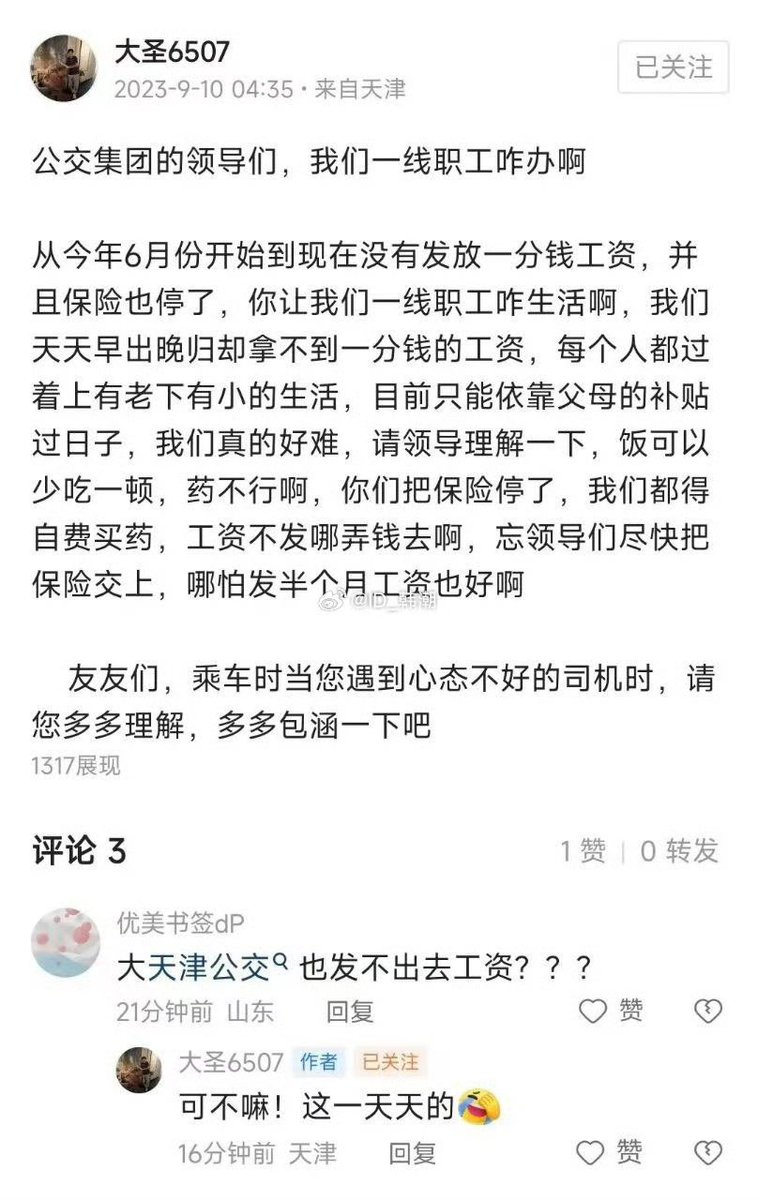 天呐!天津公交已经欠薪三个月了,连职工医保都停了!