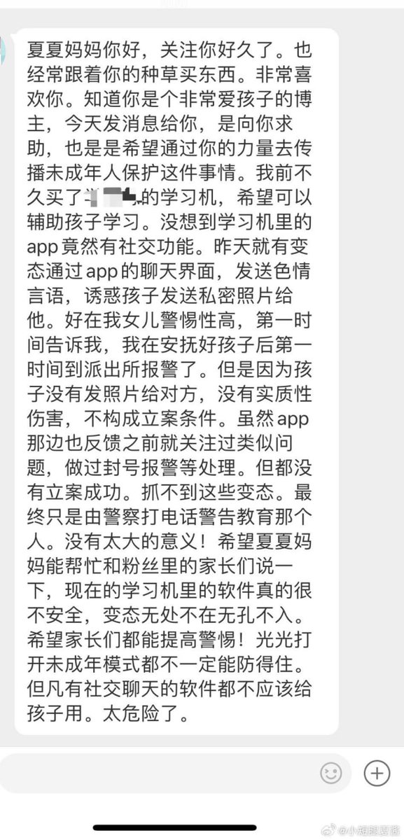 一名网友反映,女儿在国产某品牌学习机的App里被索要内裤照片。家长报警后,警察不予处理,理由:“因为没有实质性伤害,不构成立案条件”。