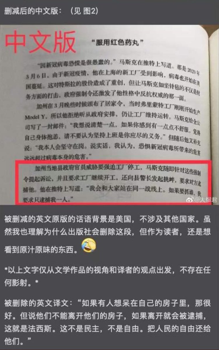 近日,马斯克的新传记在中国受到热捧,然而有网友发现,中译本删除了马斯克疫情期间批评加州政府的段落。在原版中马斯克称“(人民)他们不能离开自己的房子,如果离开就会被逮捕,这就是法西斯,这不是民主,不是自由,把人民的自由还给他们。”