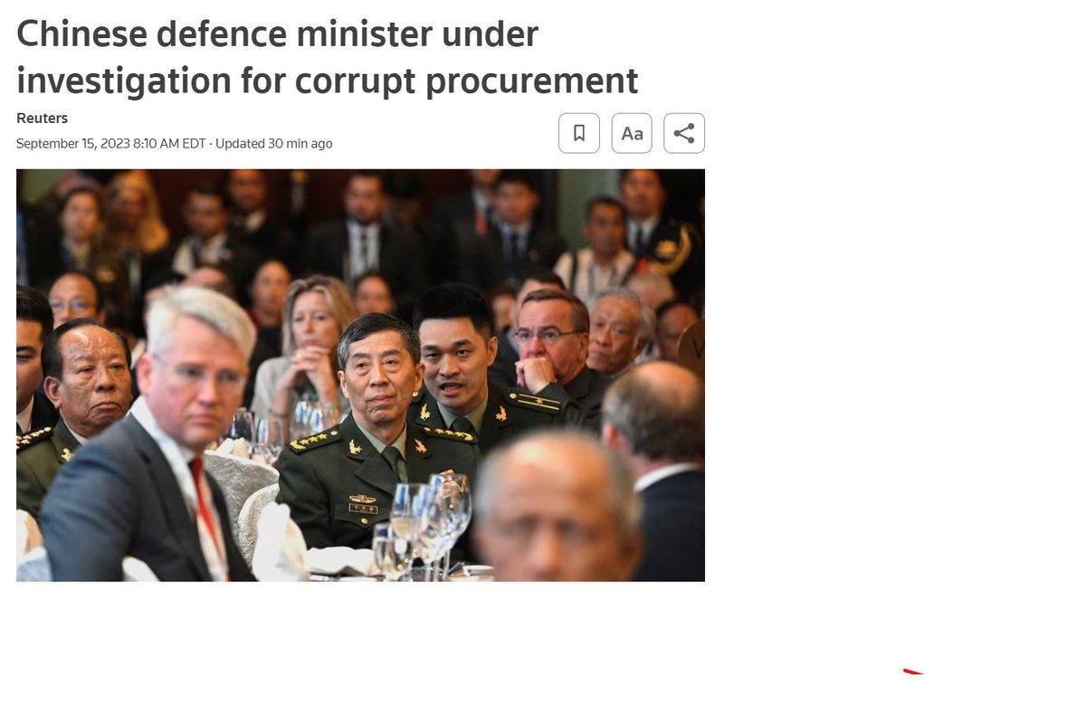 路透社最新报道,中国国防部长李尚福因为贪腐正接收调查,除此之外,中國軍方採購部門的 8…