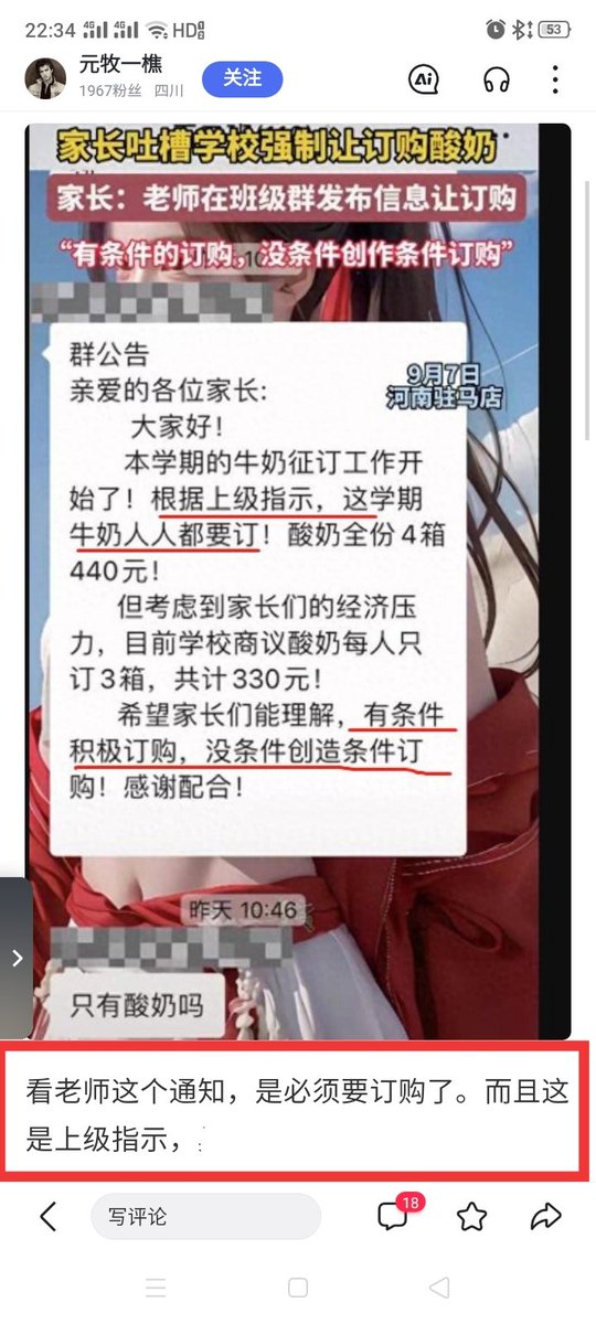 连“每天一杯牛奶,强壮一个民族”也不说了……【河南一小学要求家长订酸奶,没条件创造条件也要订】老师说法:1、人人都要订牛奶(这个来自于上级指示);2、订购的是酸奶,一共是4箱共计440元,但考虑到家长经济压力,大家只用订3箱,330元;3、有条件的家长积极订购,没有条件的家长创造条件也要订购。