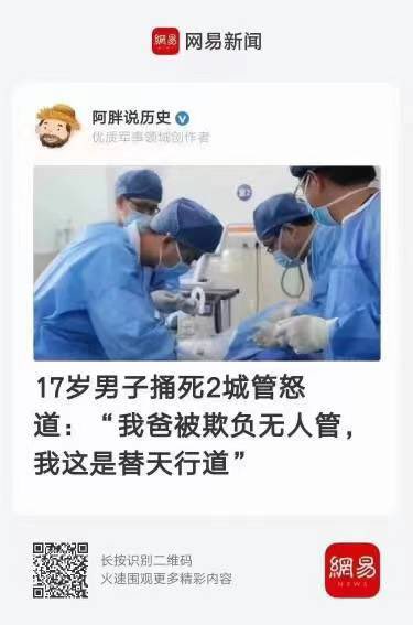 17岁男孩的父亲摆摊被城管欺负,反抗时被城管打翻油锅烫伤,不治身亡。而两城管逍遥法外。男孩捅死两城管,说是替天行道。