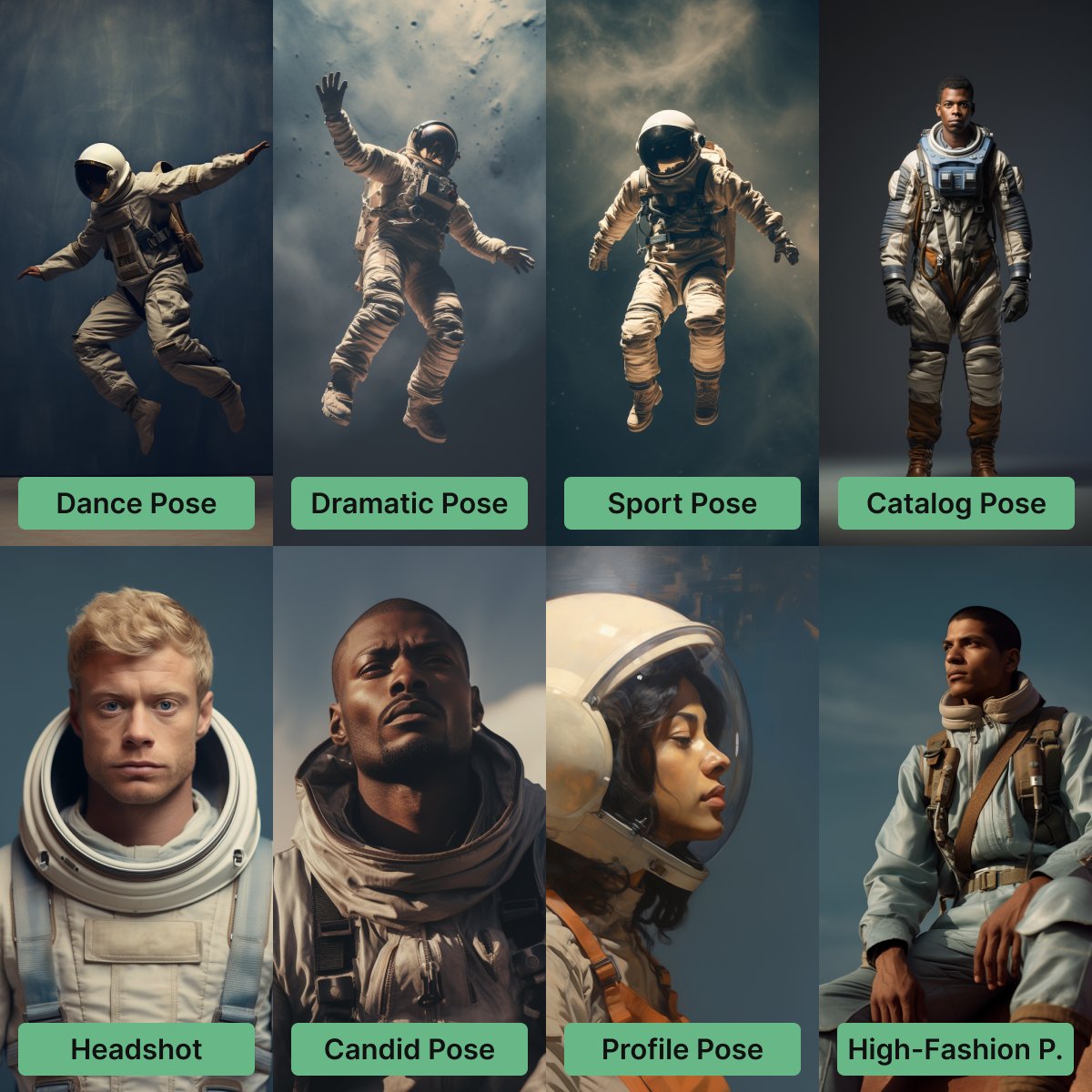 POSES IN MIDJOURNEY- Dance Pose- Dramatic Pose- Sport Pose- Catalog Pose- Headshot- Candid Pose- Profile Pose- High-Fashion PoseNote: As with everything related to AI, they may not work. It really depends on your prompt.