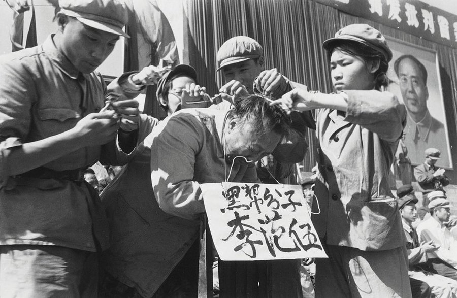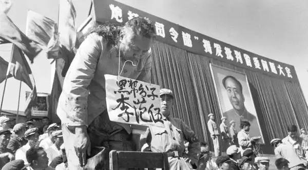 "剃鬼头"1966年末,黑龙江的“革命形势”如火如荼,省委省政府的领导被纷纷打倒,在省体育场举行的万人批斗大会上,省长李范五因“发型类似毛主席”而被扣上“大野心家”的罪名。正在台下拍摄群众场面的李振盛马上跑上台,捕捉到了红卫兵给李范五“剃鬼头”的一幕。前面那个红卫兵就调那个推子,调,拧,调,…