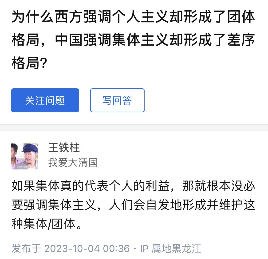 第三条回答非常好👍精准拆穿了“集体主义”的面纱:中国所谓“集体主义”只不过是拿来掩盖极端个人主义。最终仍然逃不出个人主义宿命,其个人主义反而比日本和欧美更极端。