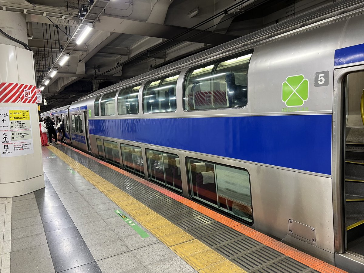 我们准备回东京站,等车时来了一辆有双层座位的+绿色标志的列车,好像方向是对的,于是不管三七二十一我们就跳了上去。