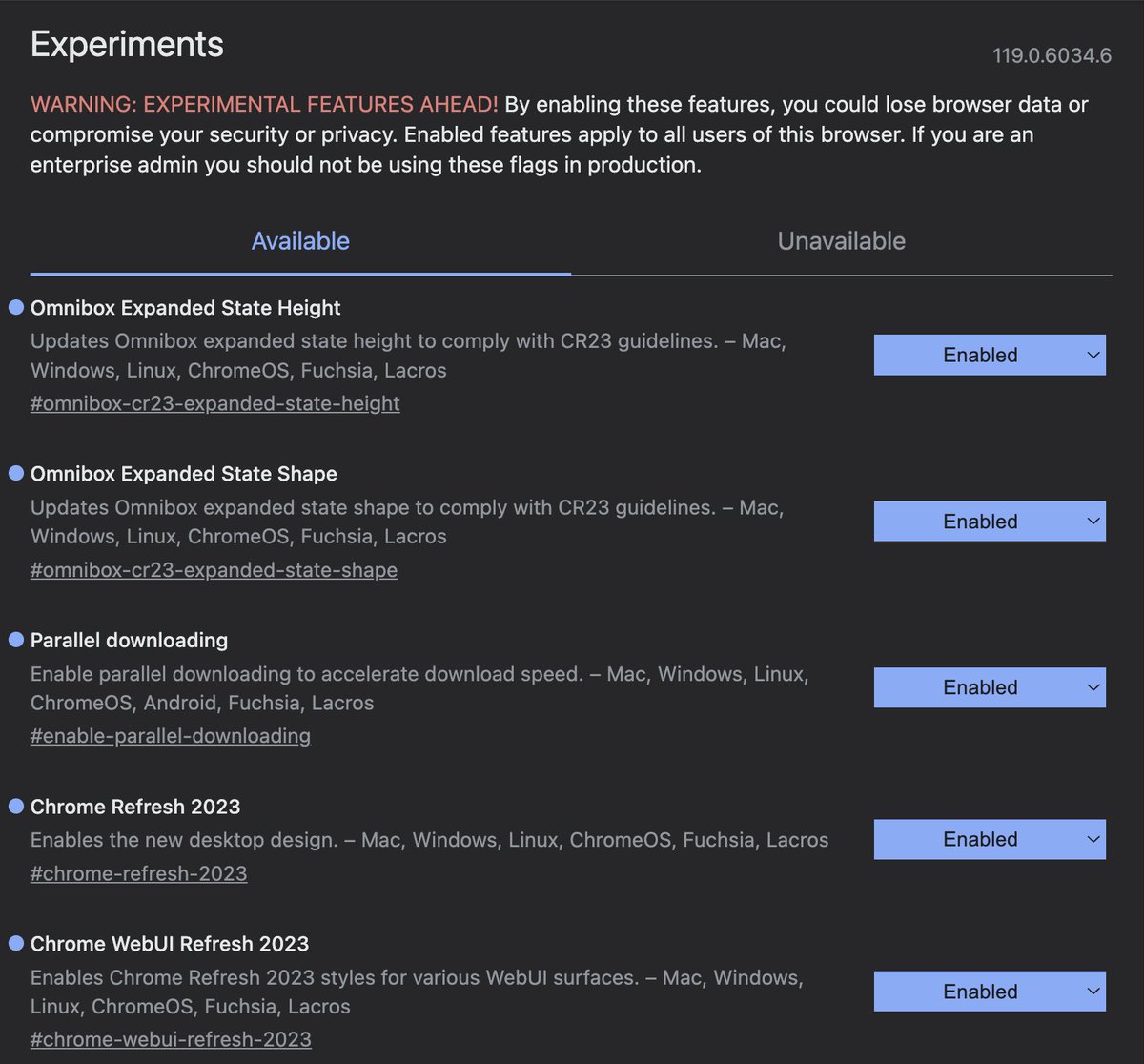 如何在 Chrome 上启用新的 UI Refresh 2023,我开启了这些,macOS 启用后真是赏心悦目。浏览器输入 chrome://flags/ - Omnibox Expanded State Height - Omnibox Expanded State Shape - Chrome Refresh 2023 - Chrome WebUI Refresh 2023 - Parallel downloading (多线程下载))