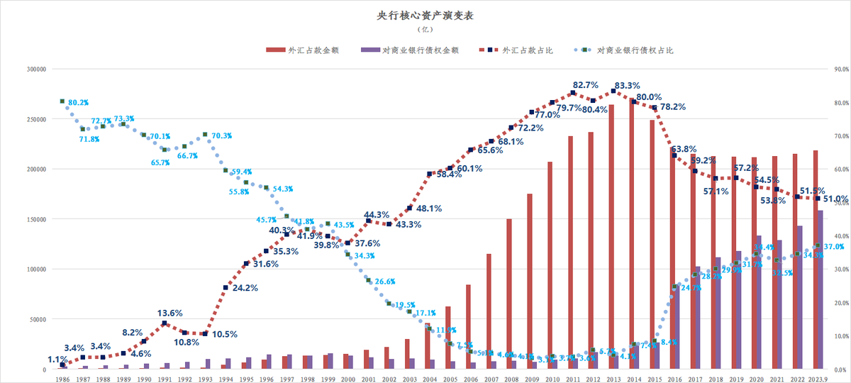 央行核心资产的演变,是一组我长期追踪的重点数据。央行最重要的两项资产,一项是外汇占款,也就是央行为了兑换外汇而印出来的基础人民币,这是以外汇为锚印钞。另一项是对商业银行借款,也就是央行印出基础人民币借给商业银行,这是以债为锚印钞。这组数据的演化过程,体现出的是央行印钞的锚,是如何…